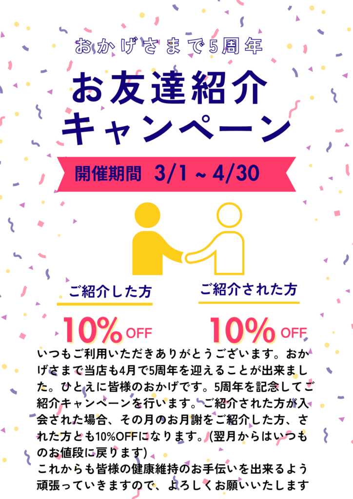 感謝の込めてお友達紹介キャンペーンを3月1日より行います。